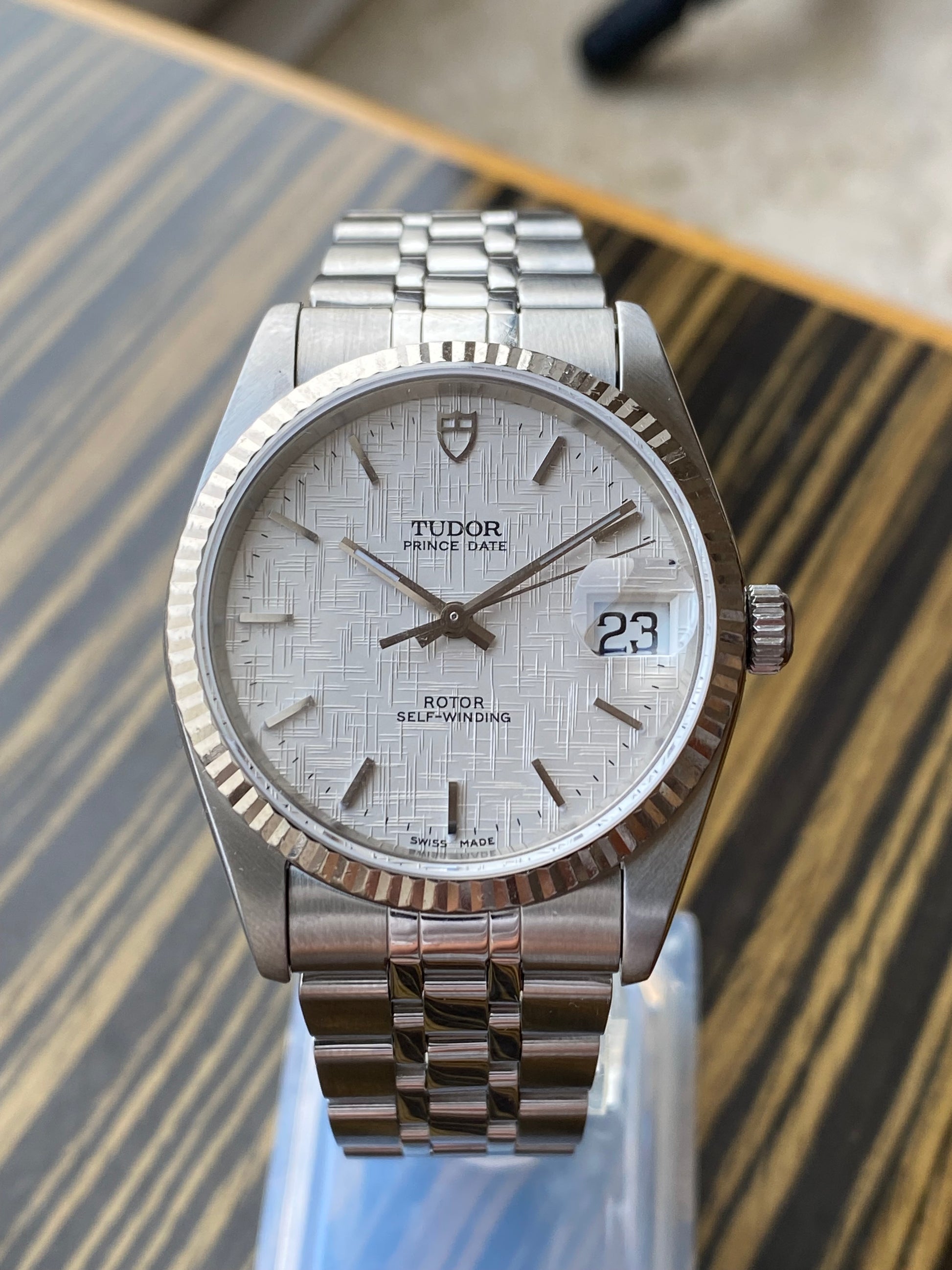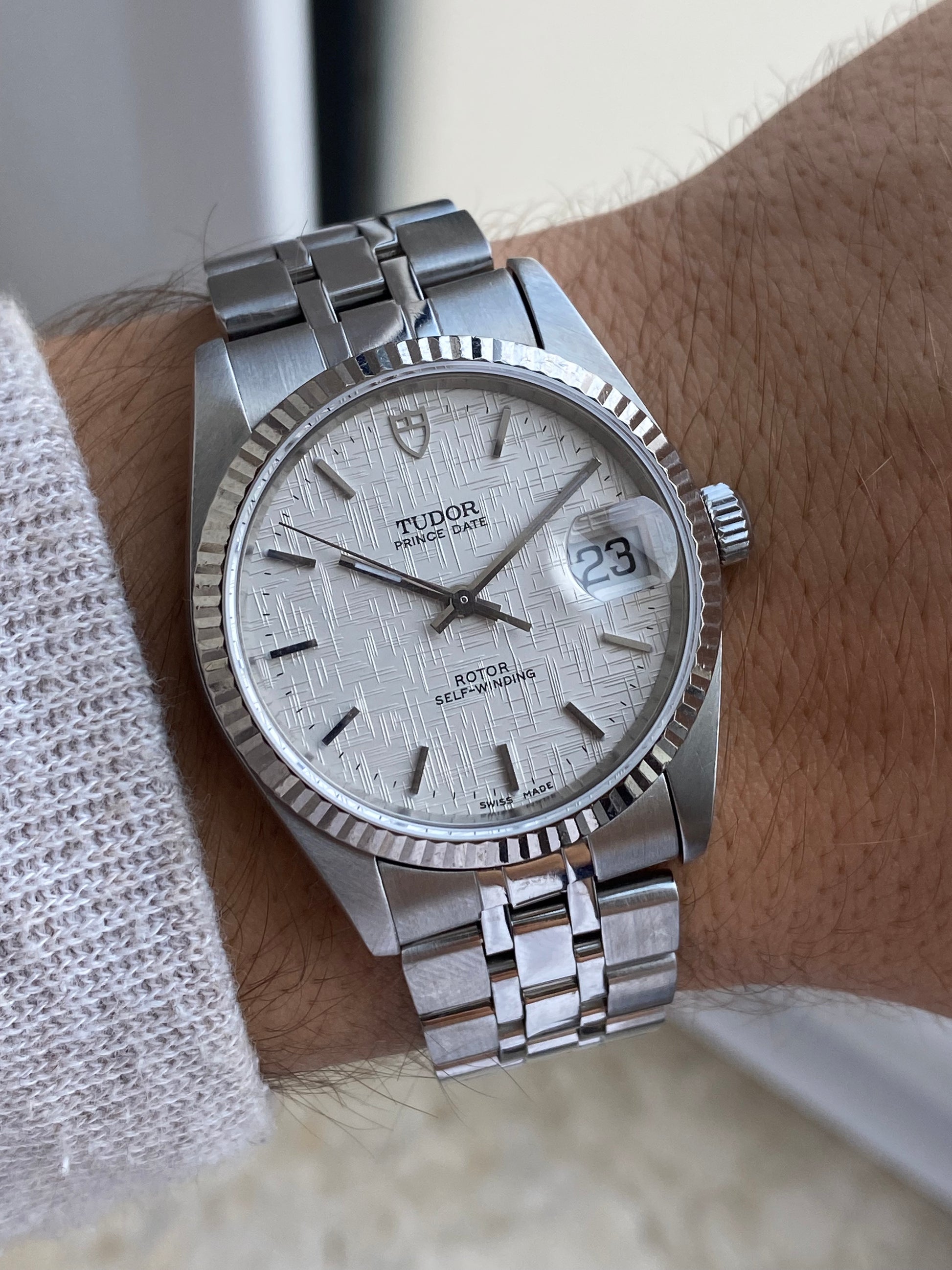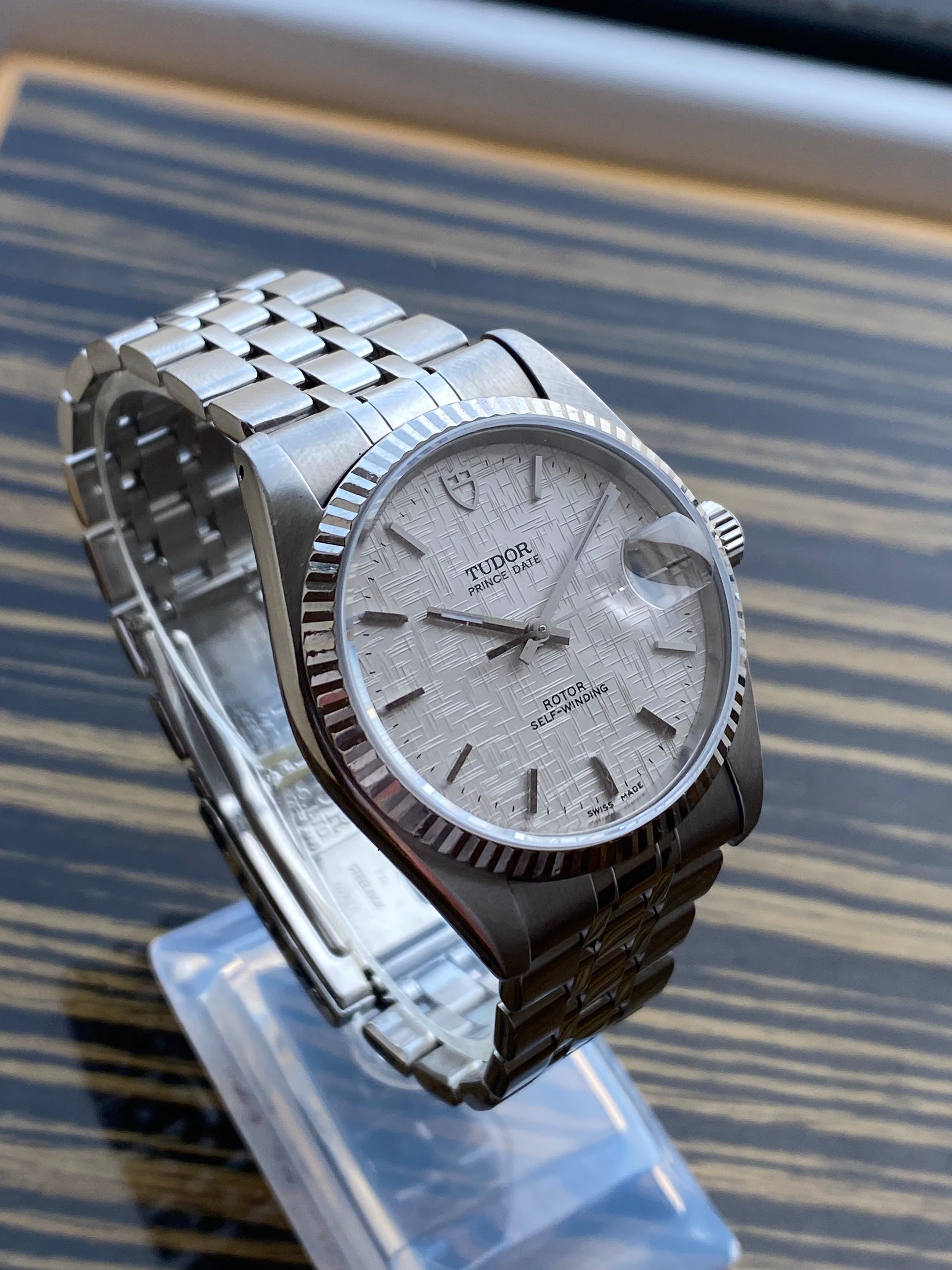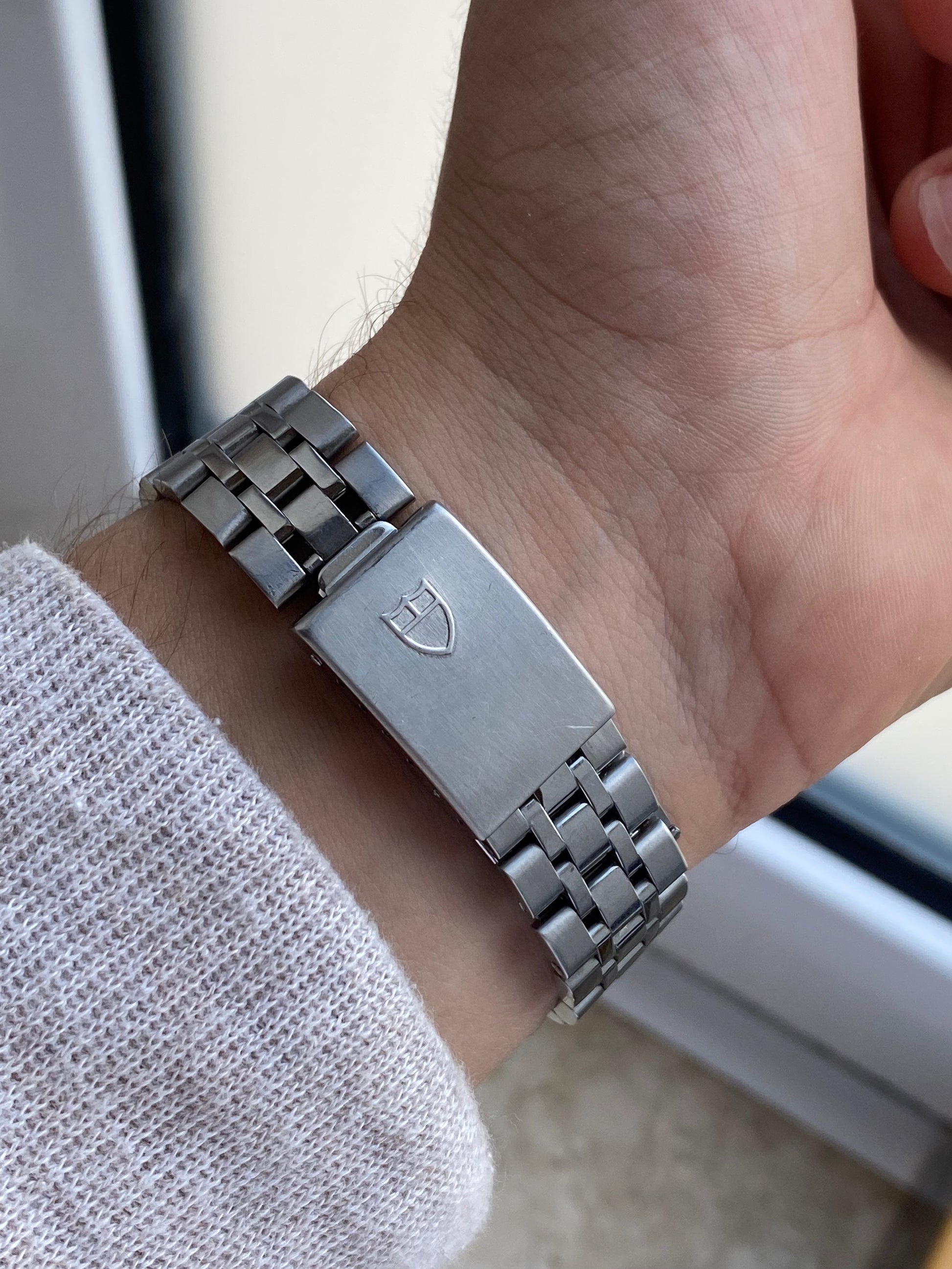 Fluted steel bezel and original screw-down crown signed by Tudor, fully functional.