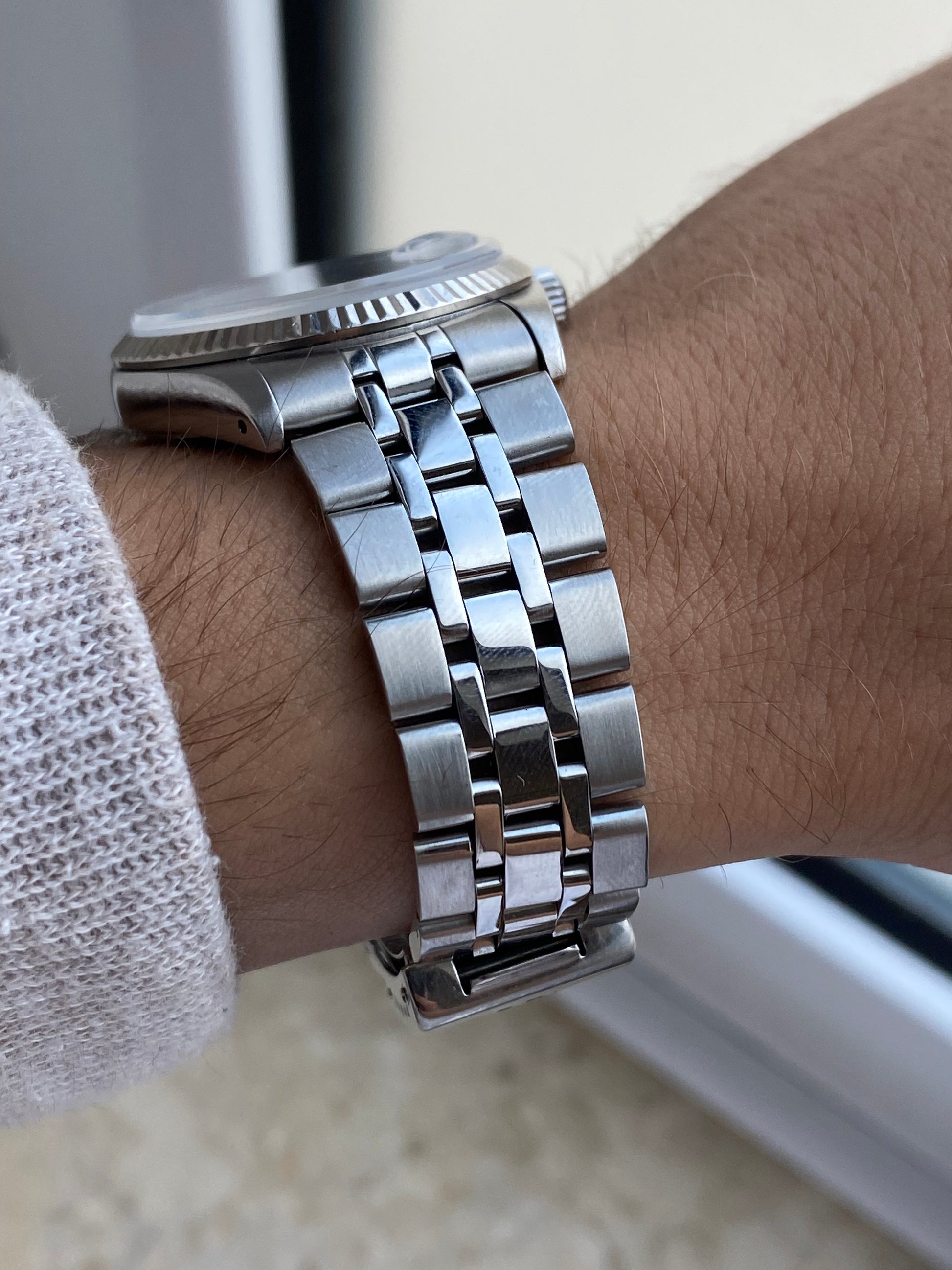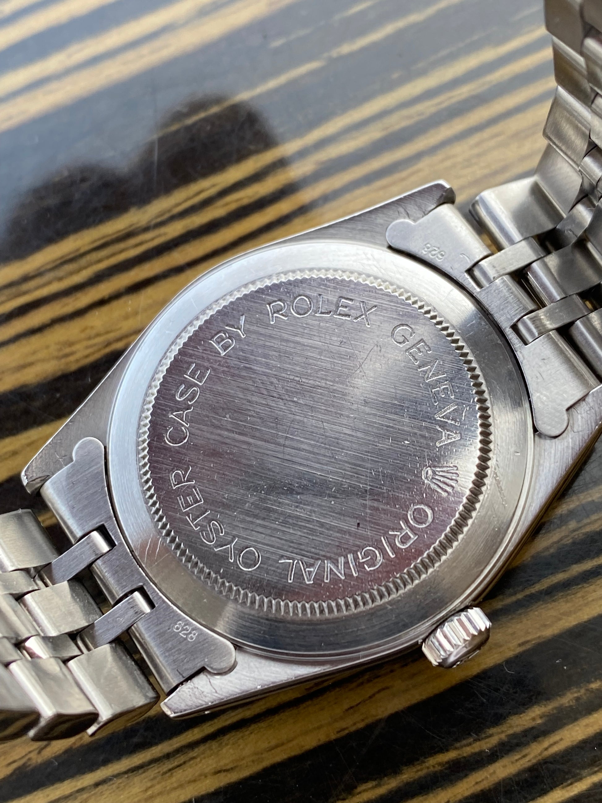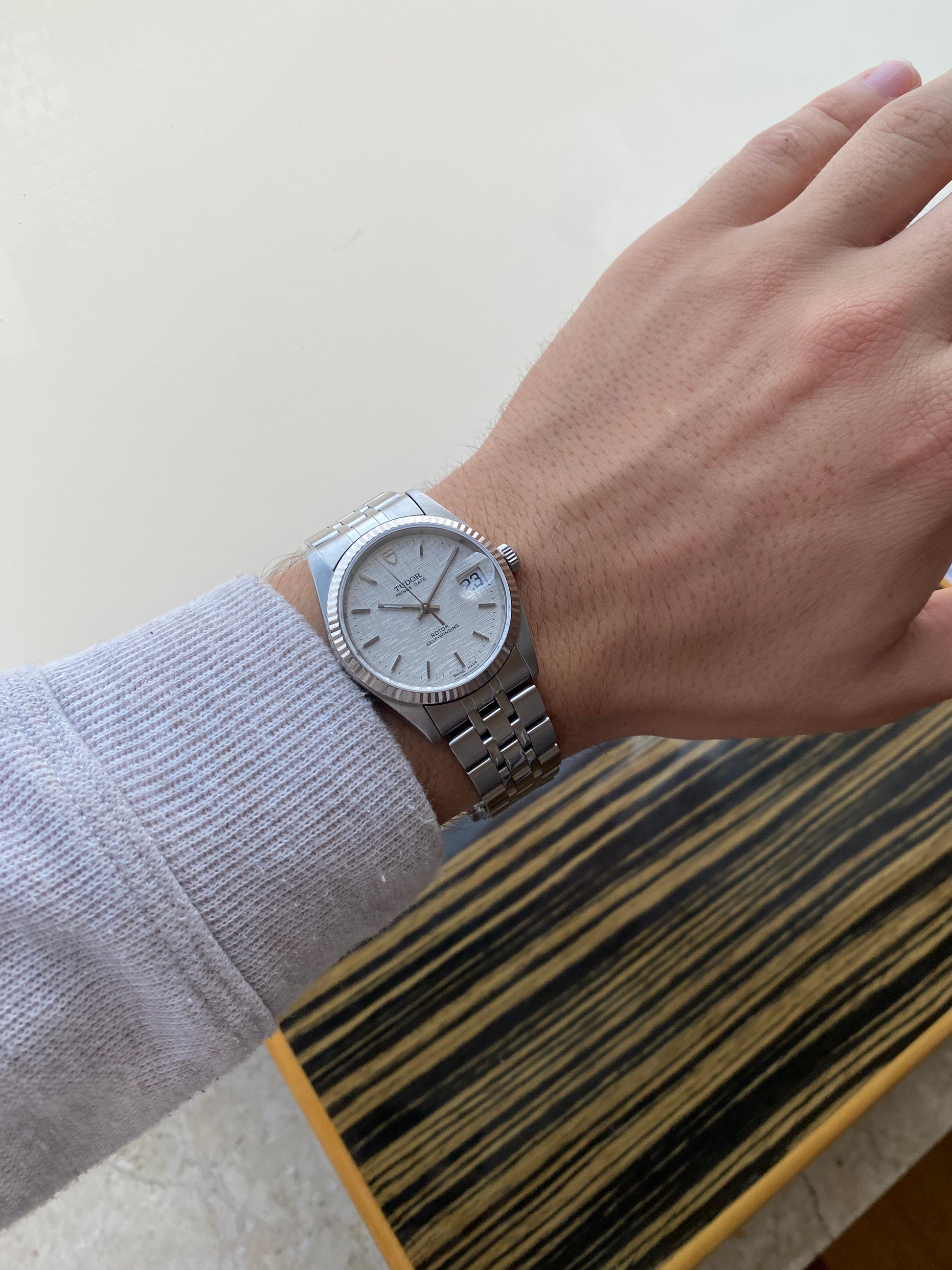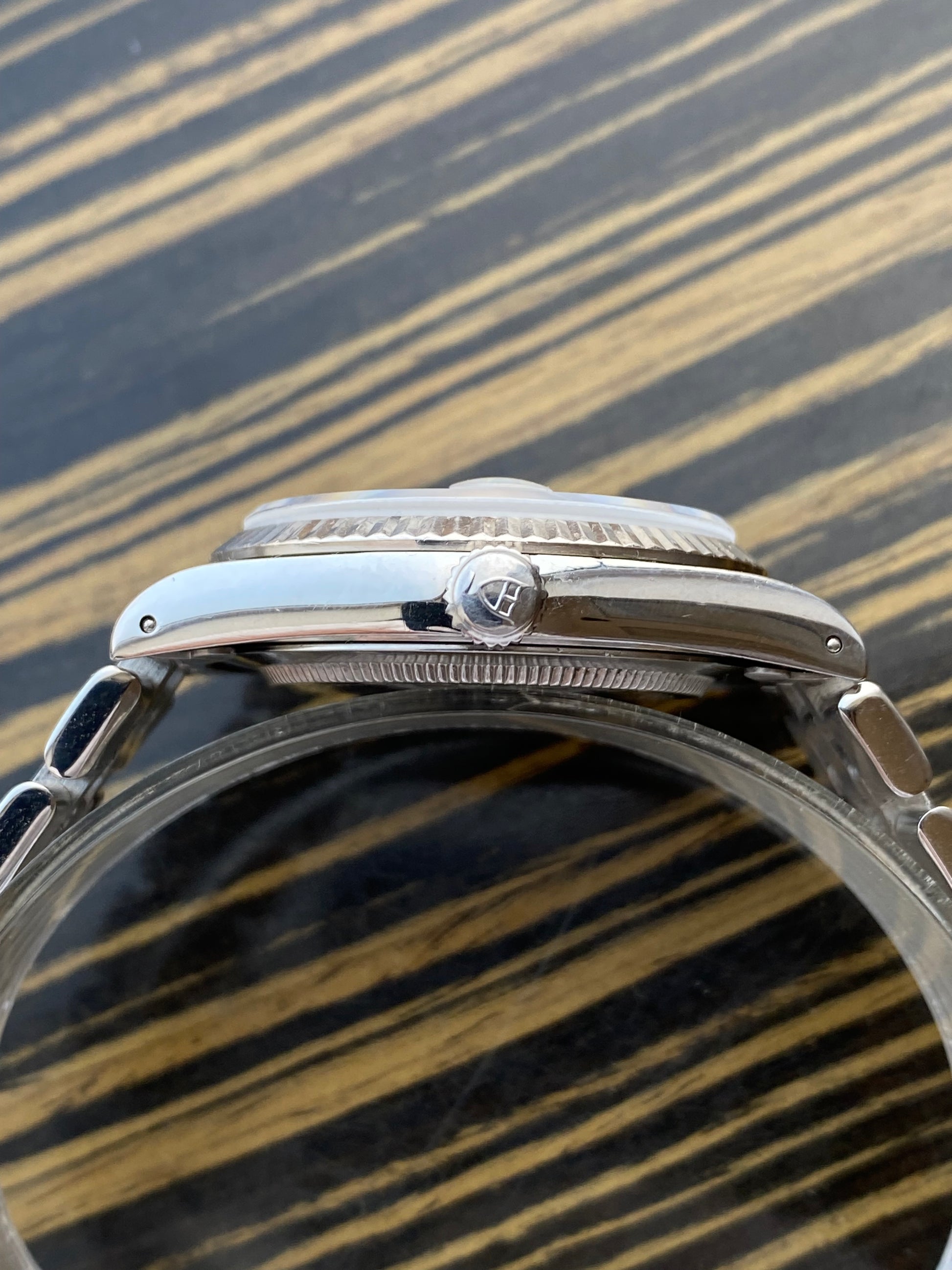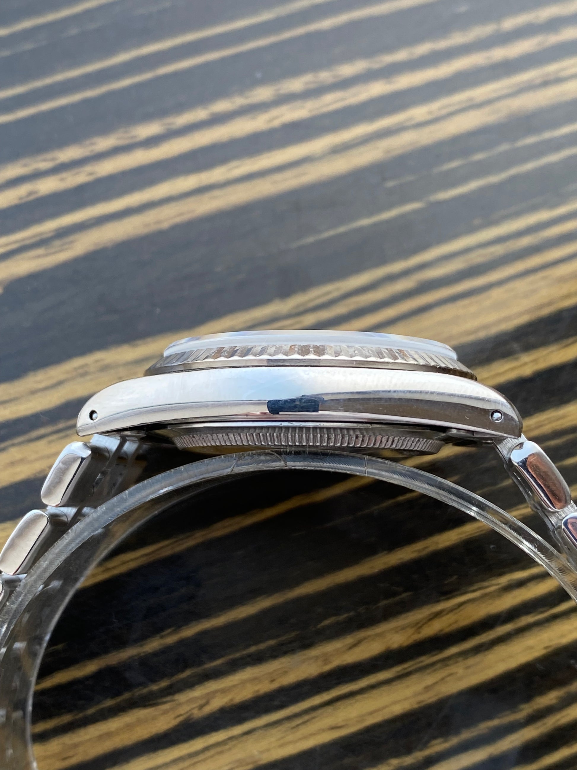 Original linen dial with date display. Hands and markers are in excellent condition.